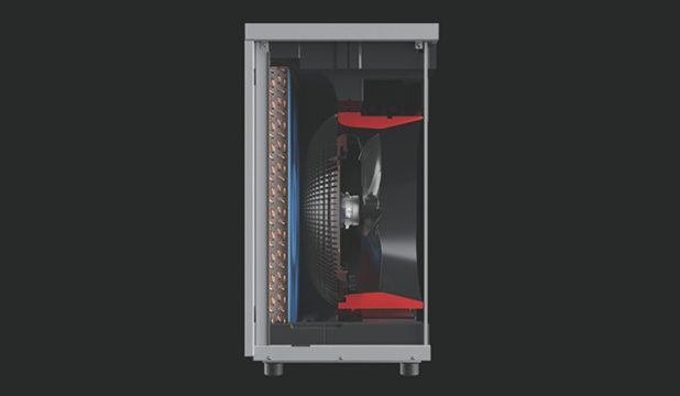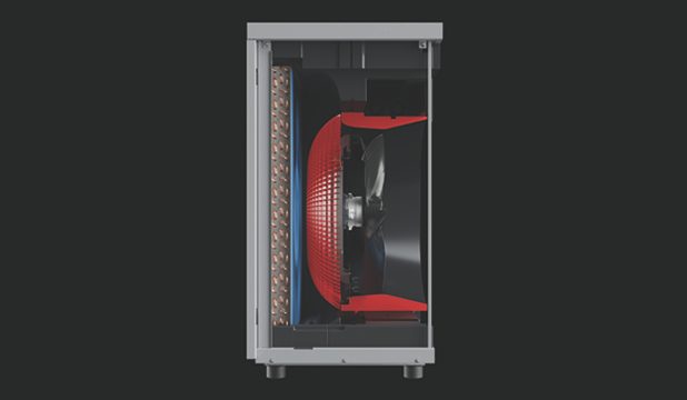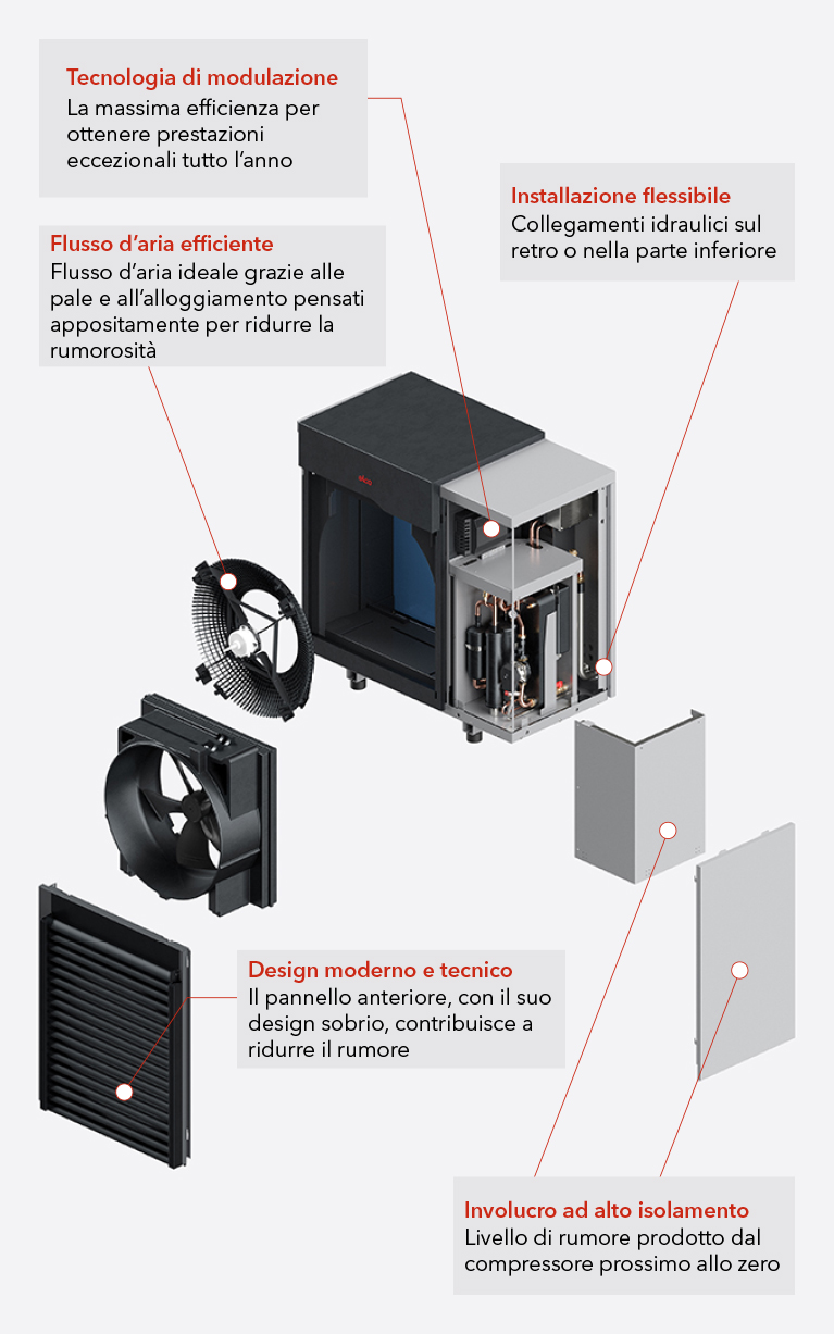 Una ventola dal flusso ottimizzato inserita in un alloggiamento appositamente concepito genera un flusso d'aria ad alta efficienza, che permette alla ventola di girare a una velocità più ridotta e produce il minor rumore di flusso possibile. Il flusso è ulteriormente ottimizzato da una griglia semisferica posta sul lato della presa d'aria della ventola all'interno della pompa di calore. Il concept è completato dalle alette presenti sul lato di scarico.