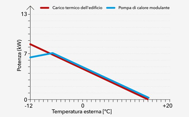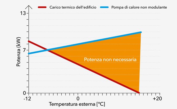 Una pompa di calore non modulante presenterà solo due modalità operative: massima potenza oppure off. Ciò significa che quando è in funzione, erogherà sempre la massima potenza in uscita possibile, anche se questa non è necessaria a causa delle temperature esterne più elevate.