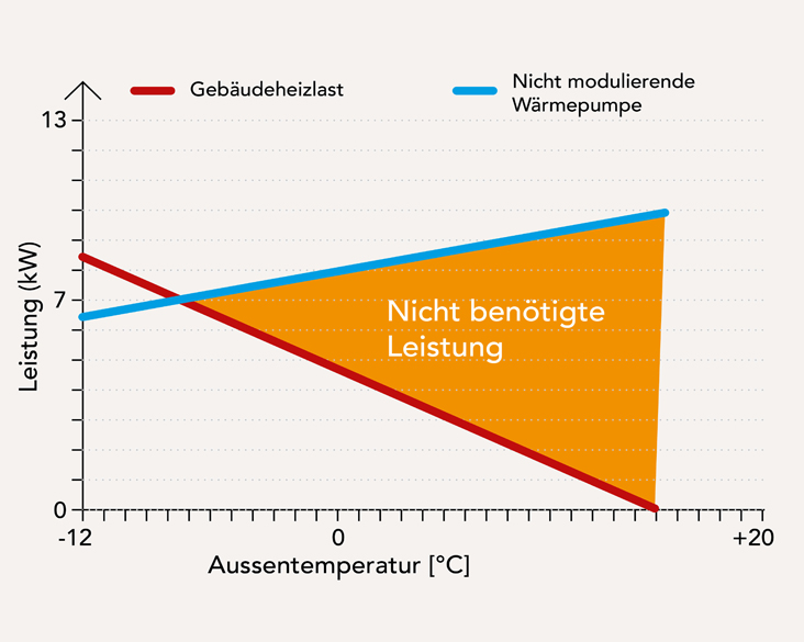 Eine nicht modulierende Wärmepumpe hat nur zwei Betriebsmodi: Sie bringt volle Leistung oder ist ausgeschaltet. Das bedeutet, dass die Wärmepumpe im Betrieb immer die höchstmögliche Leistung erbringt, auch wenn dies wegen höherer Außentemperaturen nicht nötig wäre.