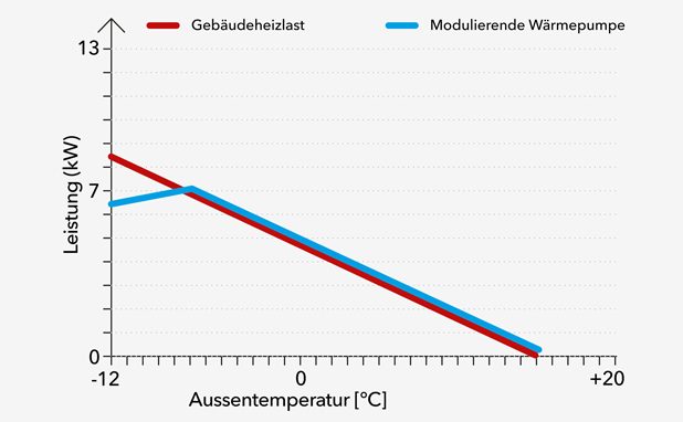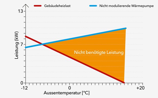 Eine nicht modulierende Wärmepumpe hat nur zwei Betriebsmodi: Sie bringt volle Leistung oder ist ausgeschaltet. Das bedeutet, dass die Wärmepumpe im Betrieb immer die höchstmögliche Leistung erbringt, auch wenn dies wegen höherer Aussentemperaturen nicht nötig wäre.