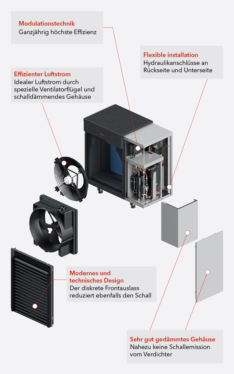 Ein strömungsoptimierter Ventilator in einem speziellen Gehäuse erzeugt einen hocheffizienten Luftstrom, der eine geringere Drehzahl ermöglicht und für geringstmögliche Strömungsgeräusche sorgt. Der Luftstrom wird durch das halbkugelförmige Gitter an der Ansaugseite des Ventilators in der Wärmepumpe weiter optimiert. Das Konzept wird abgerundet durch die Lamellen auf der Auslassseite.